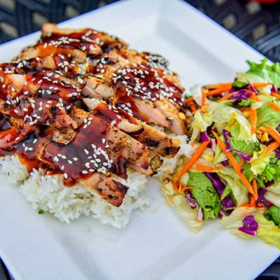 All entries come with long grain, Jasmine rice, and a house salad; served with house vinaigrette or ranch (Contains peanut products).
